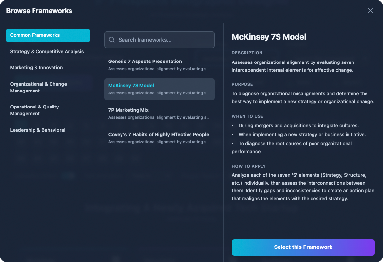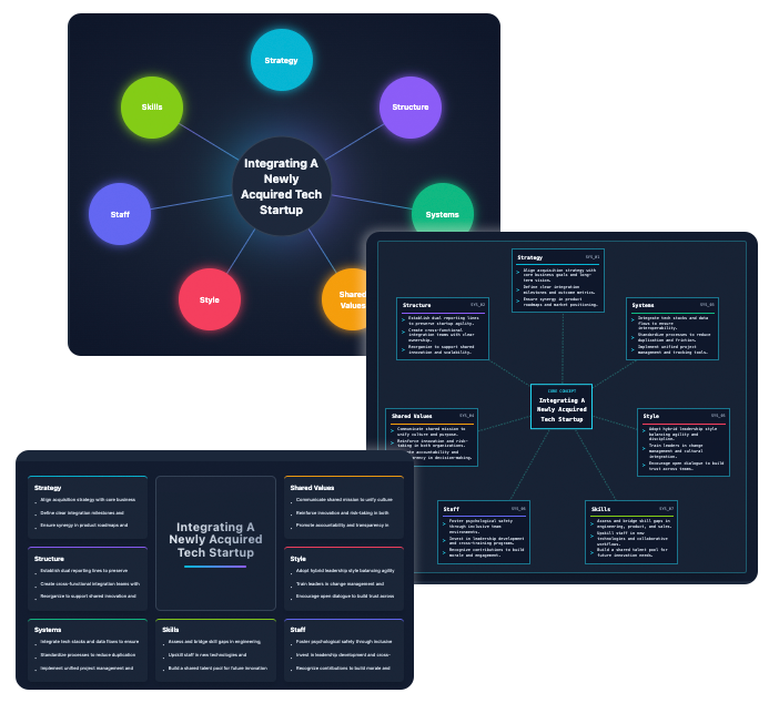Our Infographic Designer seamlessly adapts to any business or strategic model. From classic frameworks to modern approaches, quickly produce organized, professional, and visually compelling analyses—AI handles the formatting so you can focus on delivering meaningful insights.