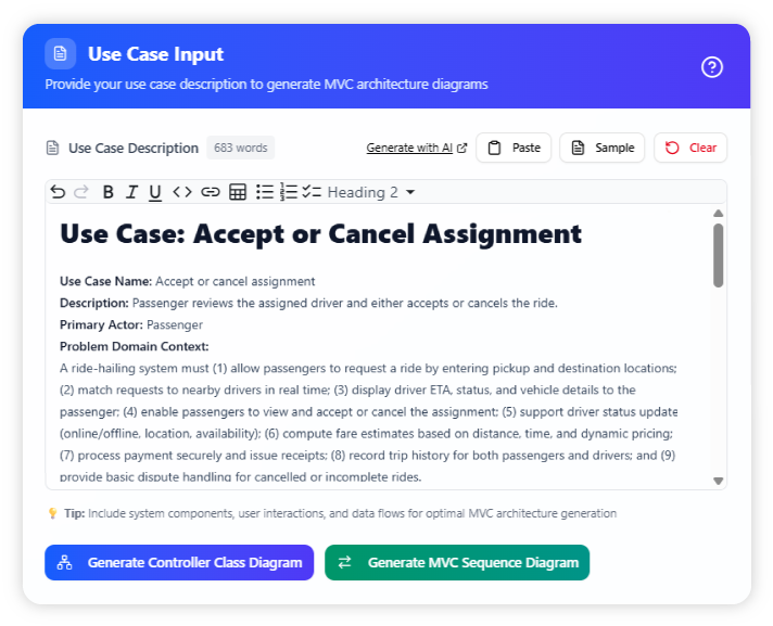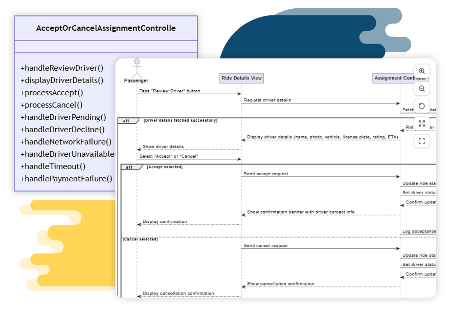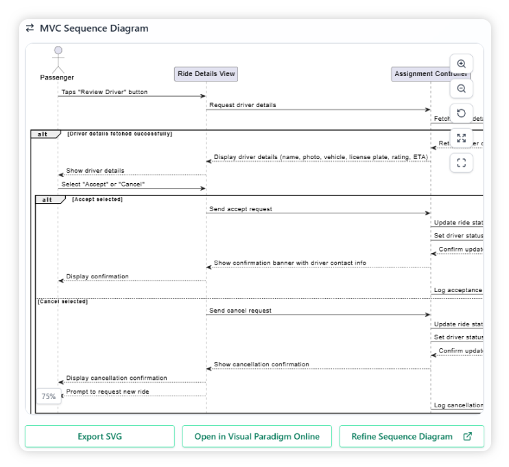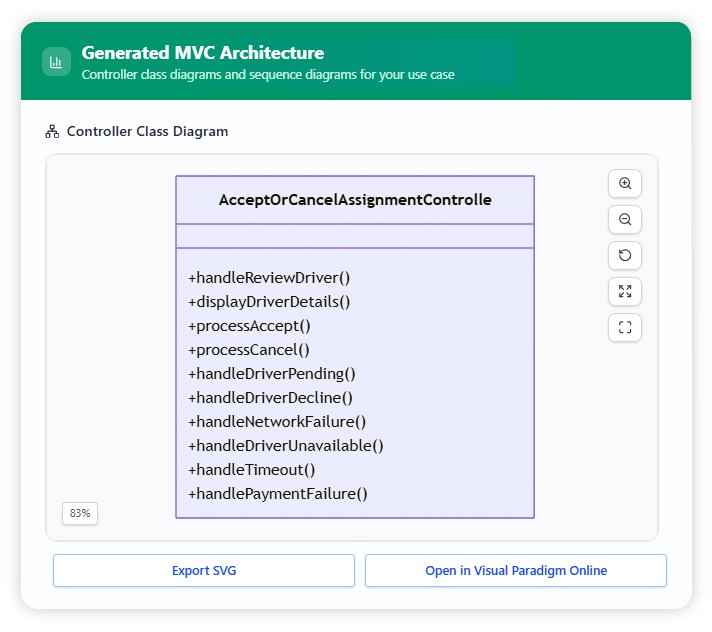 From the use case description, the tool produces an MVC sequence diagram. It maps out how the driver (Actor) receives the assignment view, how the controller processes acceptance or cancellation, and how the model updates ride status accordingly.