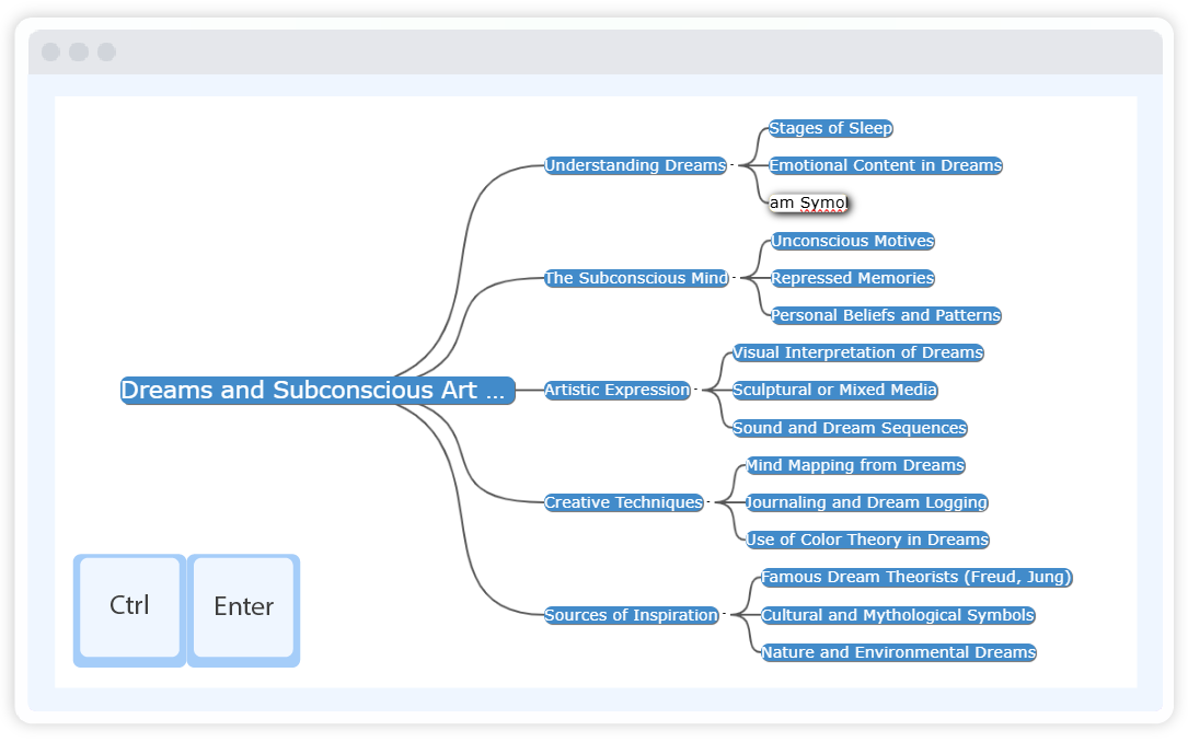 Leo expands on the ‘Understanding dream’ node by pressing Ctrl + Enter to add child nodes for ‘Symbolism’ and ‘Color Palette,’ giving his concept more structure.