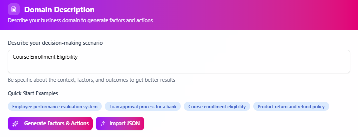 Begin by describing your process or scenario. Outline the conditions such as Course Enrollment Eligibility. Click Generate Factors & Actions to proceed.