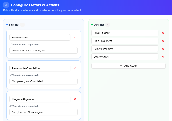 The AI reviews your scenario and suggests key factors and actions. Factors include conditions like student status, prerequisite completion, and other relevant criteria, while actions include outcomes like enroll student, hold enrollment, or other applicable decisions. The AI suggests additional factors or actions you might overlook. You can add, modify, or delete these to fit your needs.
