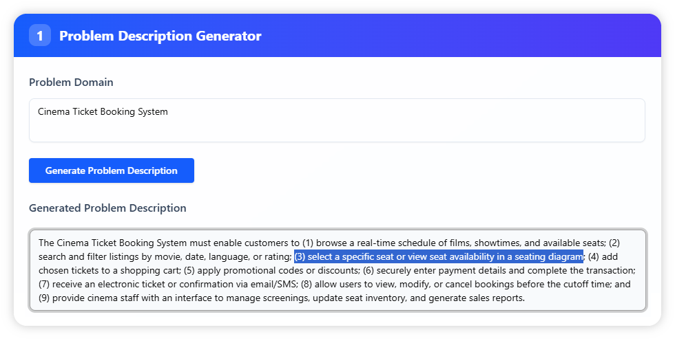 Enter Cinema Ticket Booking System as the problem domain. The tool produces a comprehensive and editable problem description that covers customer interactions such as browsing schedules, selecting seats, processing payments, and staff functions like managing screenings and reports. You can refine the description to align with your cinema’s unique requirements.