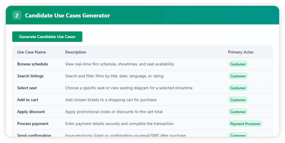 With the problem domain in place, press the “Generate Candidate Use Case” button. The tool creates candidate use cases with their name, description, and primary actor. For this example, the generated set includes browsing schedules, searching listings, selecting seats, adding to cart, applying discounts, processing payments, sending confirmations, managing bookings, and staff-level screening management.