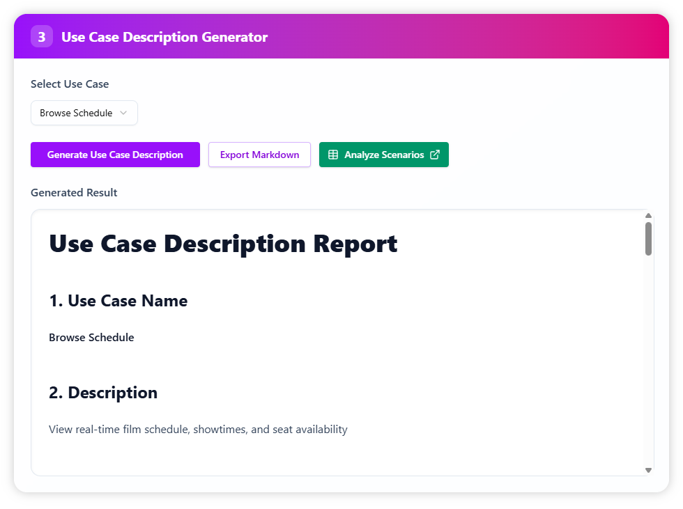 Choose one candidate to expand into a detailed description. Here, the selected use case is Browse schedule. The generator produces a structured description with preconditions, main flow, alternative flows, and exceptions, ensuring that different booking scenarios are clearly addressed. The description can also be exported in Markdown format for integration into documentation or project files.