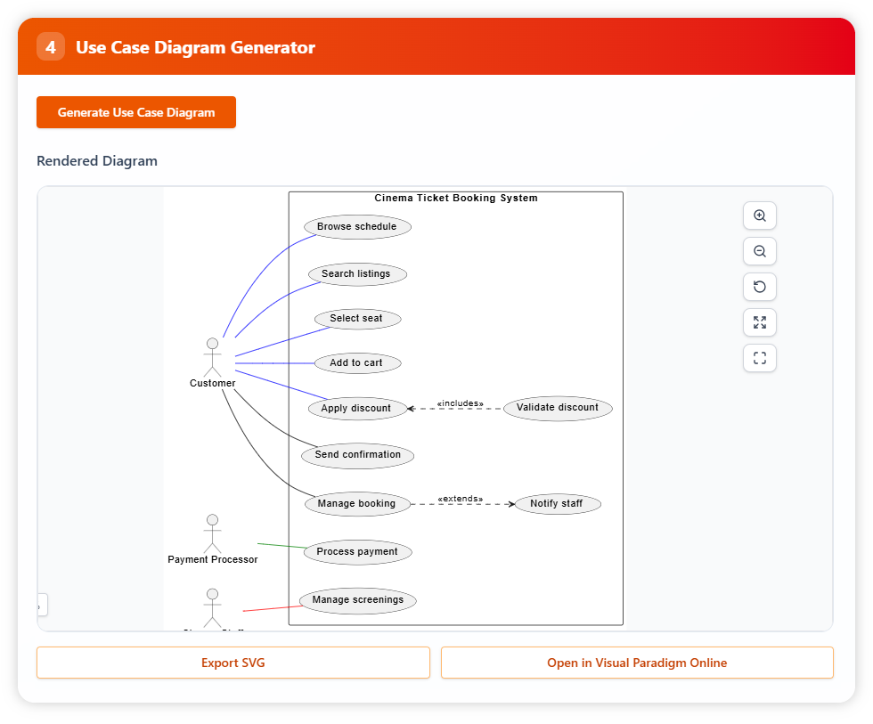 Finally, generate a use case diagram showing the interactions between customers, cinema staff, payment processors, and the various booking activities. The diagram can be exported as an SVG or opened in Visual Paradigm Online for further editing and collaboration.