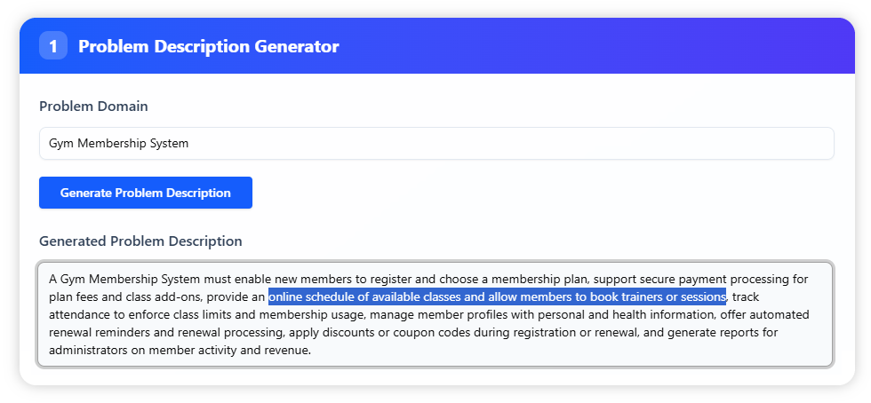 Enter Gym Membership System as the problem domain. The tool produces a detailed and editable problem description, outlining everything from member registration and payment to class scheduling, discounts, renewals, and reporting. You can adjust the description to fit the exact policies or services of your gym.
