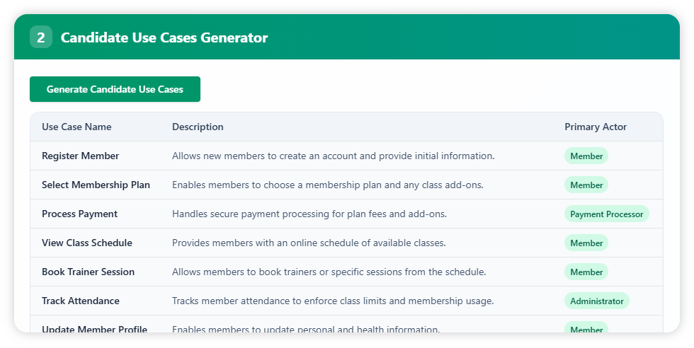 Click the “Generate Candidate Use Case” button to produce a set of candidate use cases, each with a name, description, and primary actor. For this domain, use cases include registering members, selecting membership plans, booking trainers, processing payments, managing renewals, applying discounts, and generating reports.