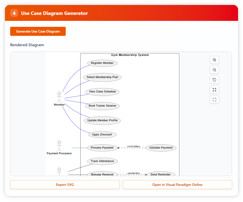 Finally, generate a use case diagram showing interactions between members, administrators, and payment processors. The diagram can be exported as SVG or opened in Visual Paradigm Online for collaboration and refinement.