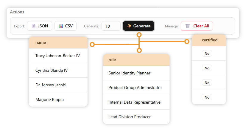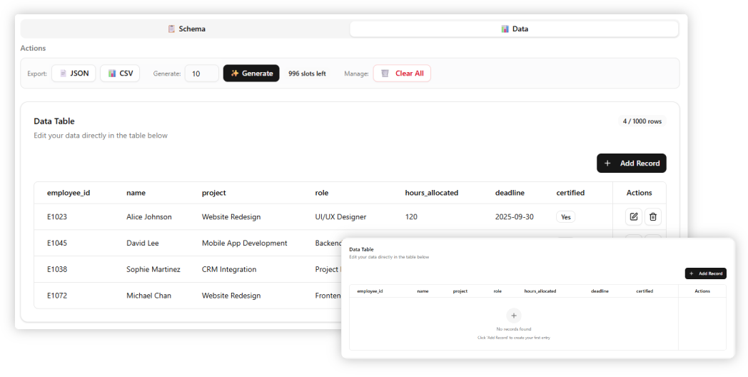 Enter the number of rows, then click the Generate button to populate the table with sample data. All generated rows can also be customized with the Edit Record button.