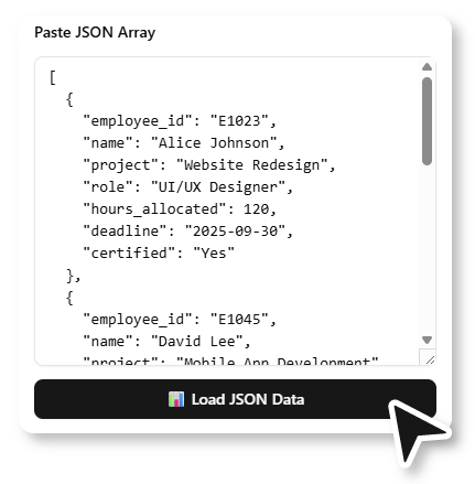 Begin by either pasting your existing JSON array directly into the editor, then press “Load JSON Data” button. Our tool will instantly transforms it into a fully editable table.