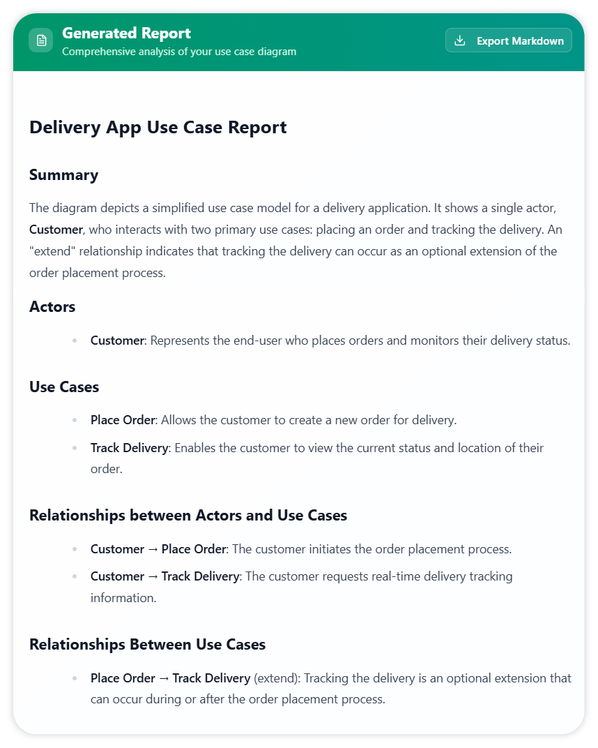 Our PlantUML Use Case Report Generator eliminates these challenges by automating the documentation process. By leveraging PlantUML’s text-based diagramming, you can define use case diagrams quickly and let our AI handle the rest. With one click, it transforms your code into a polished, professional report.