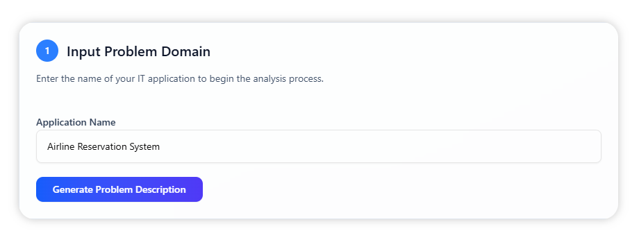 Specify the problem domain: Airline Reservation System. This initial step equips the AI with the context needed to define the platform’s purpose, user roles, and core workflows for both travelers and airline staff.
