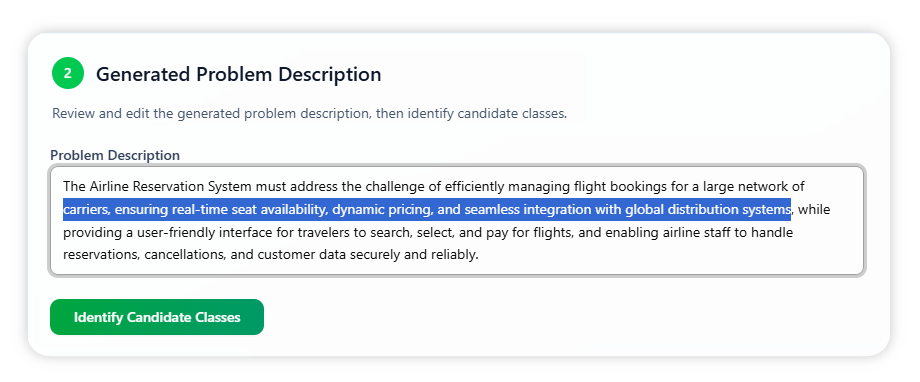 The AI processes the given domain and produces a detailed problem description that covers flight scheduling, dynamic pricing adjustments, integration with global distribution systems, booking confirmation, and secure payment handling. This generated description can be tailored to match the unique requirements of a specific airline network before moving forward.