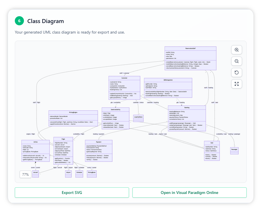 All confirmed classes, their attributes, and their interconnections are compiled into a clean, professional class diagram. You can instantly preview it in your browser, download it as an SVG file, or fine-tune it using Visual Paradigm Online.