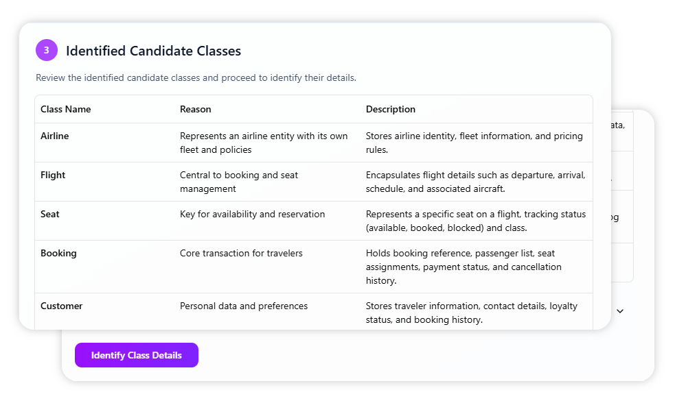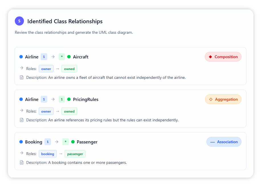 The AI maps the relationships between the identified classes, showing which entities are connected, the role of each within the relationship, a brief explanation of the connection, and the type of association—be it aggregation, composition, or standard association. This step offers a clear picture of how components interact in the booking ecosystem.