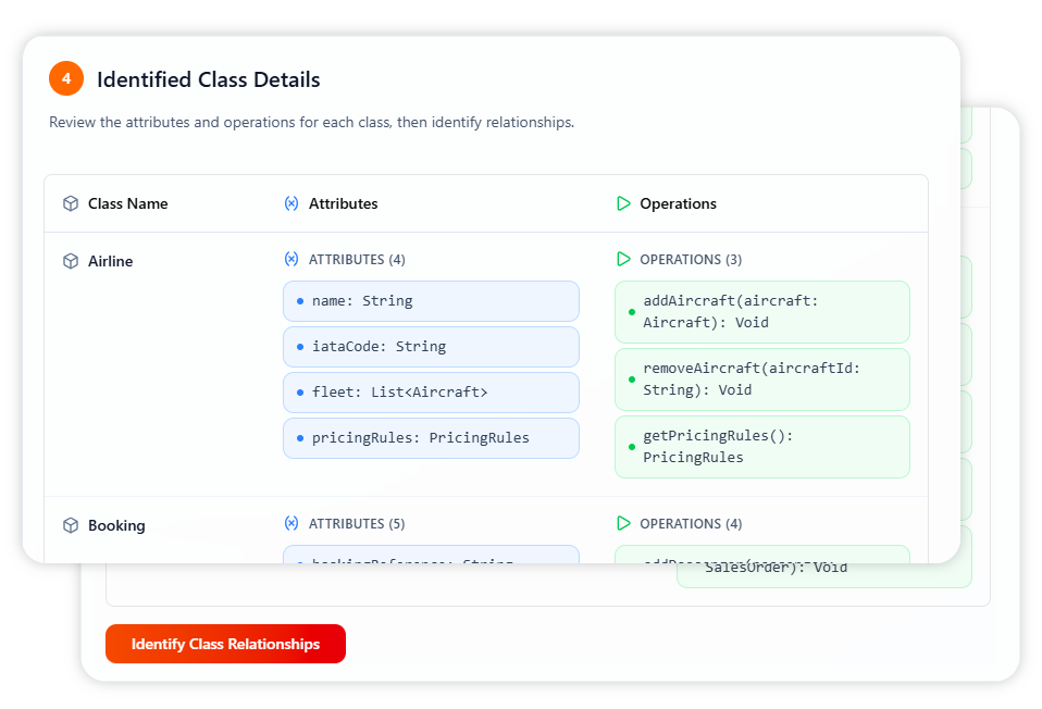 After confirming the classes, the AI lists attributes and operations for each entity. Attributes capture essential information such as flight numbers, passenger details, and booking statuses, while operations represent actions like reserving seats, processing payments, or issuing tickets. This breakdown provides a precise specification for each class’s responsibilities.