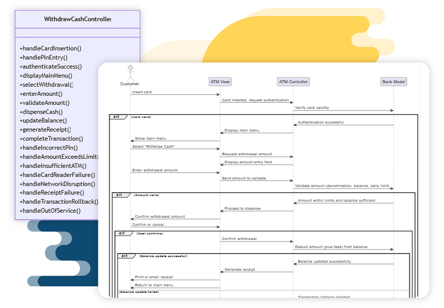 The Withdraw Cash use case is one of the most common scenarios in an ATM system. It illustrates how a customer interacts with the ATM machine to insert their card, verify their PIN, and withdraw money from their bank account. Using the Sequence Diagram Refinement Tool, this basic flow can be systematically expanded into an MVC architecture with detailed controller, view, and model objects.