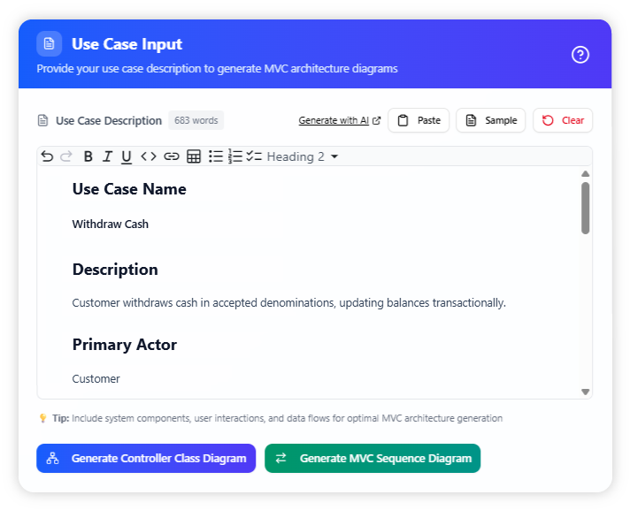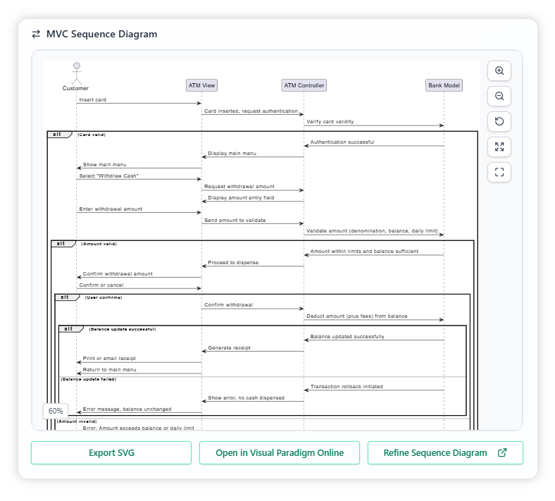 A detailed MVC sequence diagram is then generated based on the use case description. This diagram expands the basic interactions into an MVC structure, showing the ATM interface elements (View), processing logic (Controller), and banking system components (Model).