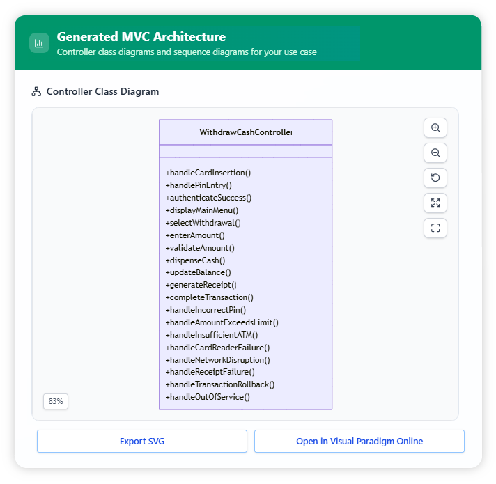 From the Withdraw Cash use case, the tool generates a controller class diagram to represent the logic handling user actions.