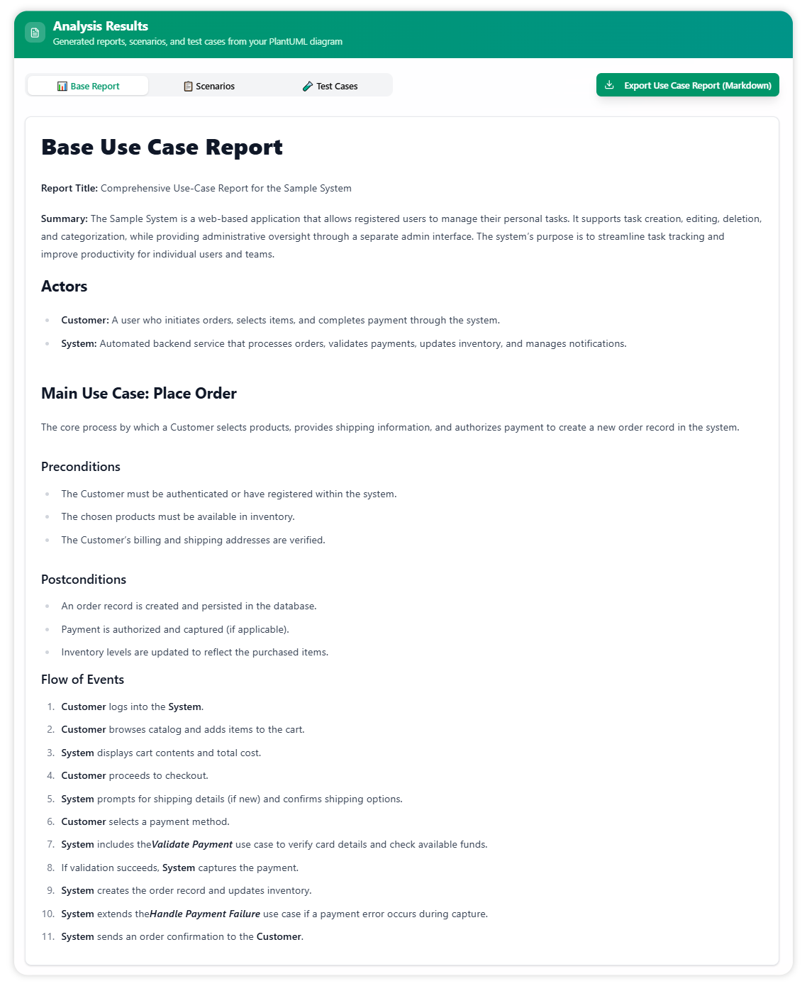 The AI analyzes actors (Rider, Driver) and relationships (includes, extends). The report summarizes ride booking, lists actors, details flows (preconditions, post-conditions, alternatives, exceptions like no drivers), and covers sub-use cases. Export as Markdown for sharing.