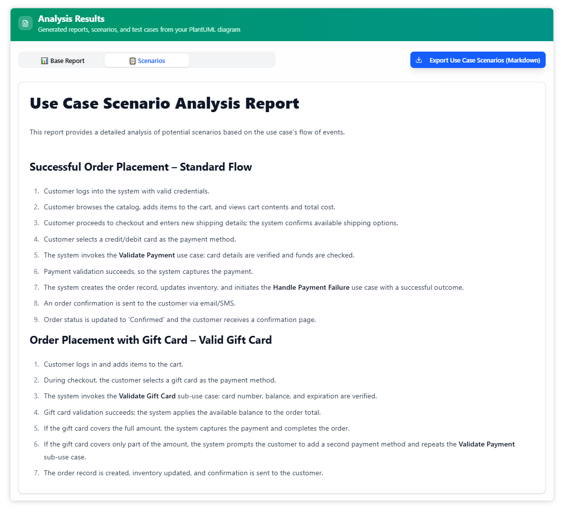 Click “Generate Scenarios” to create narratives like Basic Ride Booking or Premium Ride Request. These support user stories and testing alignment.