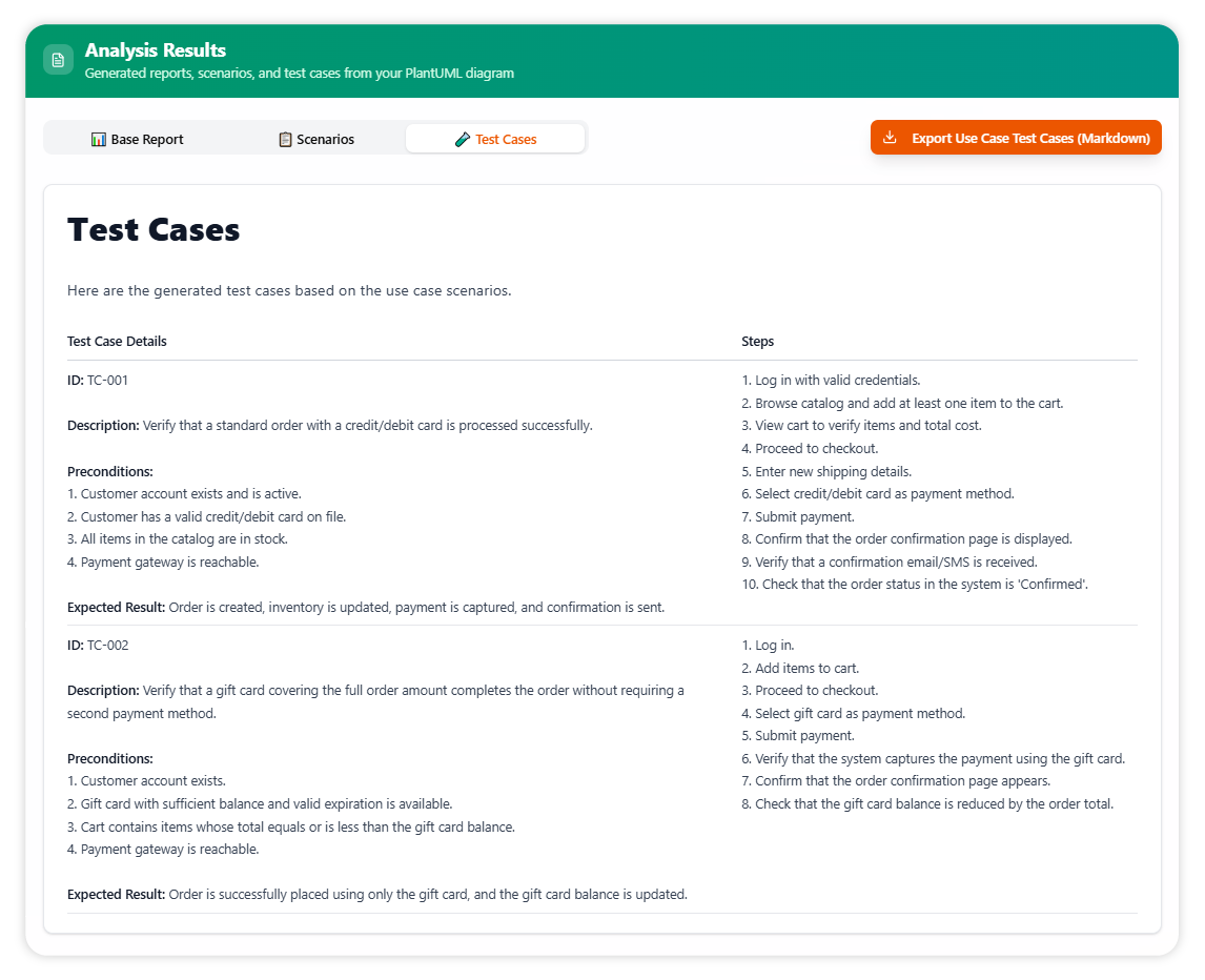 Click “Generate Test Cases” to produce tests with ID, description, preconditions, steps, and expected results. These integrate with QA tools for robust ride booking testing.