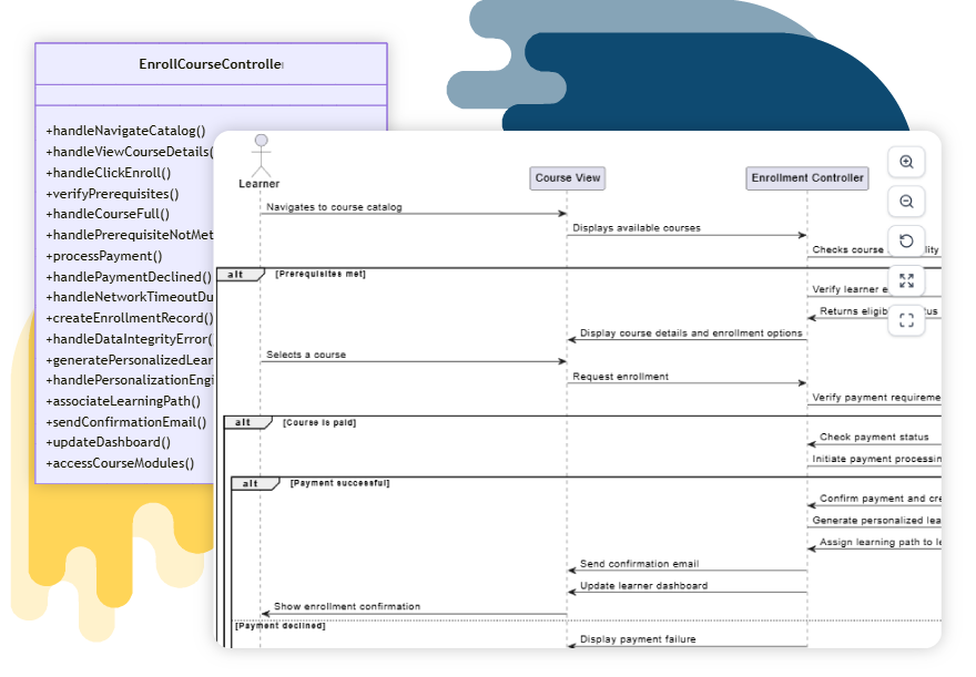 The Enroll in Course use case is a central feature in many e-learning platforms. It shows how a student browses the course catalog, reviews details, checks prerequisites, and confirms enrollment. With the Sequence Diagram Refinement Tool, this flow can be expanded into MVC architecture to reveal how the interface, controller, and backend systems work together to support smooth course enrollment.