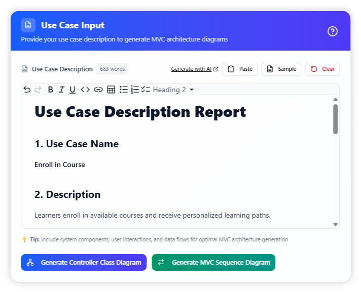 After preparing the description, you can continue to generate both the Controller Class Diagram and the MVC Sequence Diagram directly.