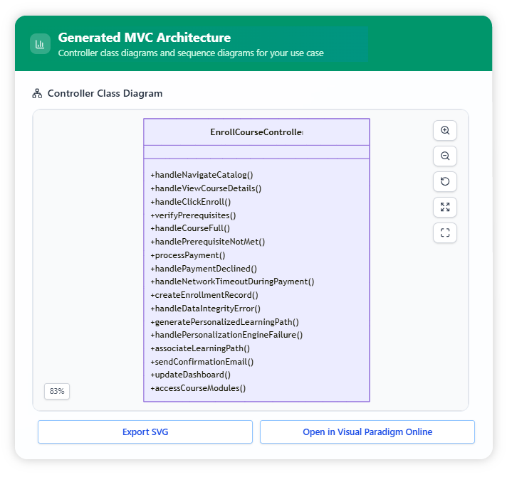 The tool produces a controller class diagram that highlights the flow of student actions during enrollment. This helps visualize how the controller organizes different interactions before connecting them to the view and model layers.
