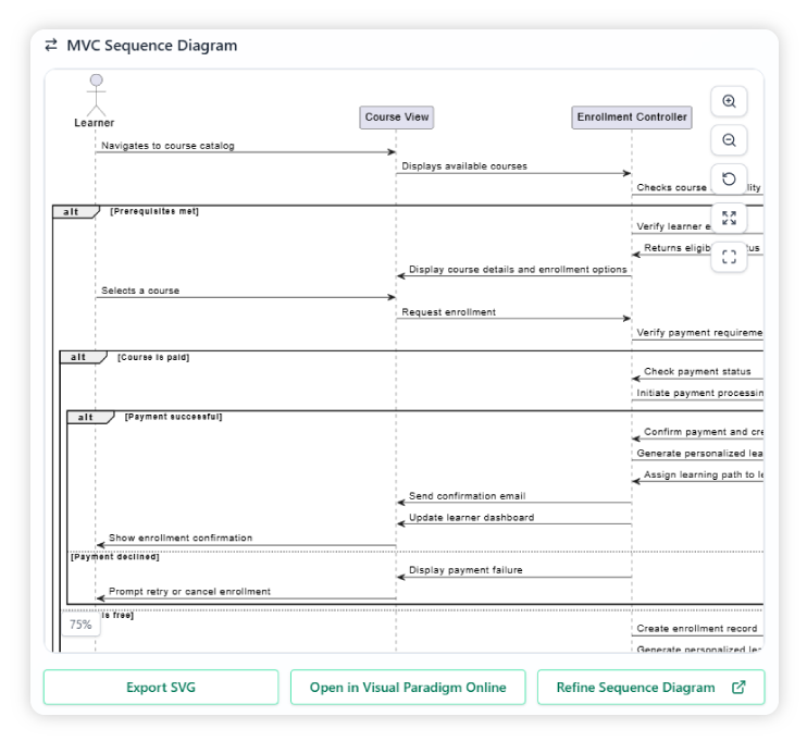 From the use case description, the tool generates an MVC sequence diagram showing how the student interacts with the catalog and course views, how the controller manages prerequisite checking, and how the backend updates the enrollment records.