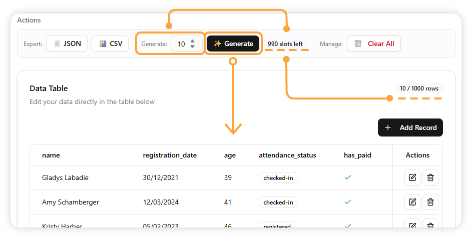 Review the generated records, all records are editable. We can manually add, delete and edit the records on the table. When finished, we can export the table as JSON and CSV formats.