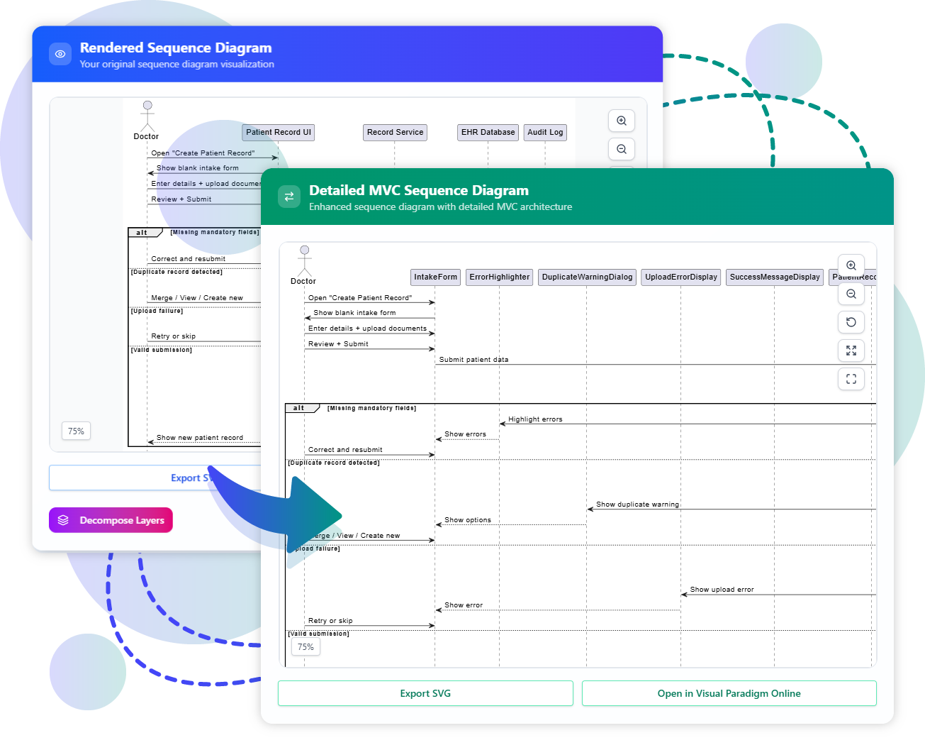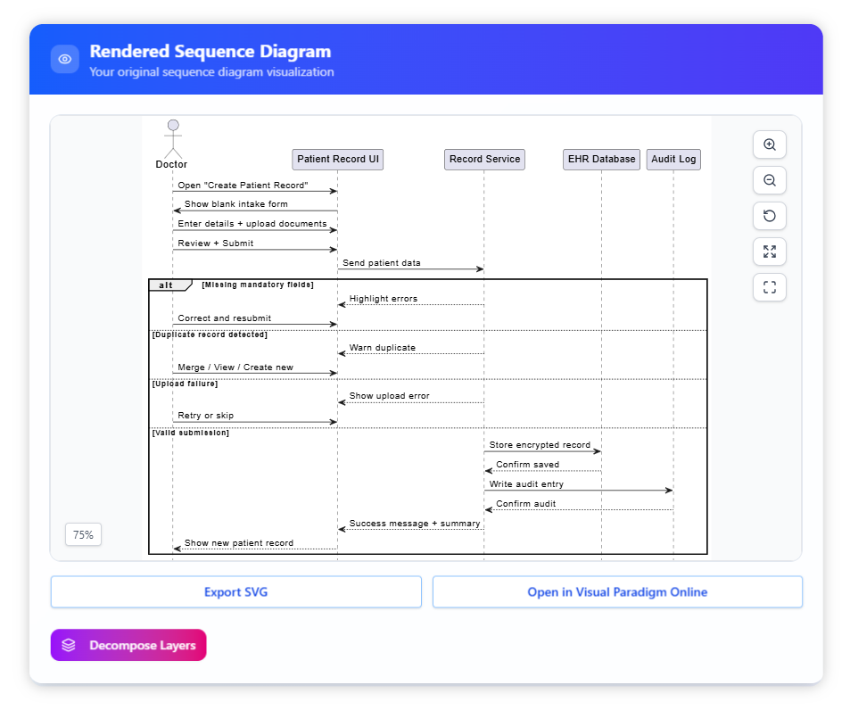 Click Render Diagram to see the initial visualization of the patient record workflow. From here, you may download it as SVG or adjust it in Visual Paradigm Online. To move beyond this preview and refine the design, proceed with Decompose Layers.