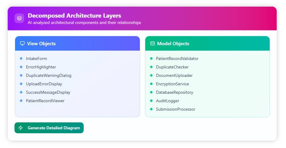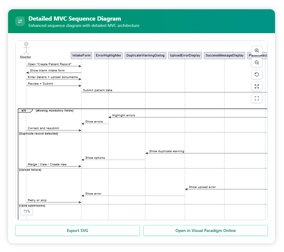 Start by entering a Mermaid or PlantUML sequence diagram that represents the creation of a patient record. If you prefer not to write it from scratch, you can generate one directly using the MVC System Architecture Generator.