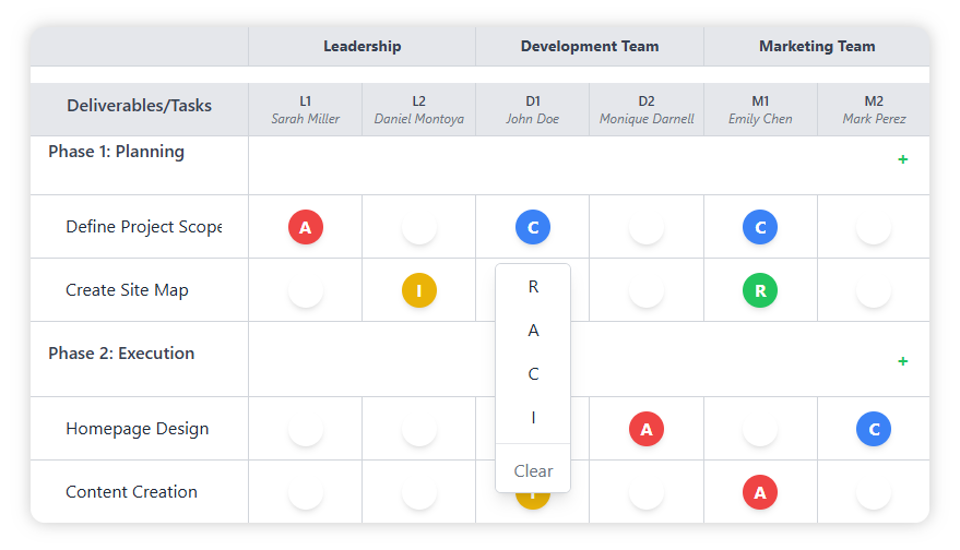 With the RACI Matrix Generator, you can create matrices that evolve as projects shift from planning to execution and adapt to both structured and iterative phases.