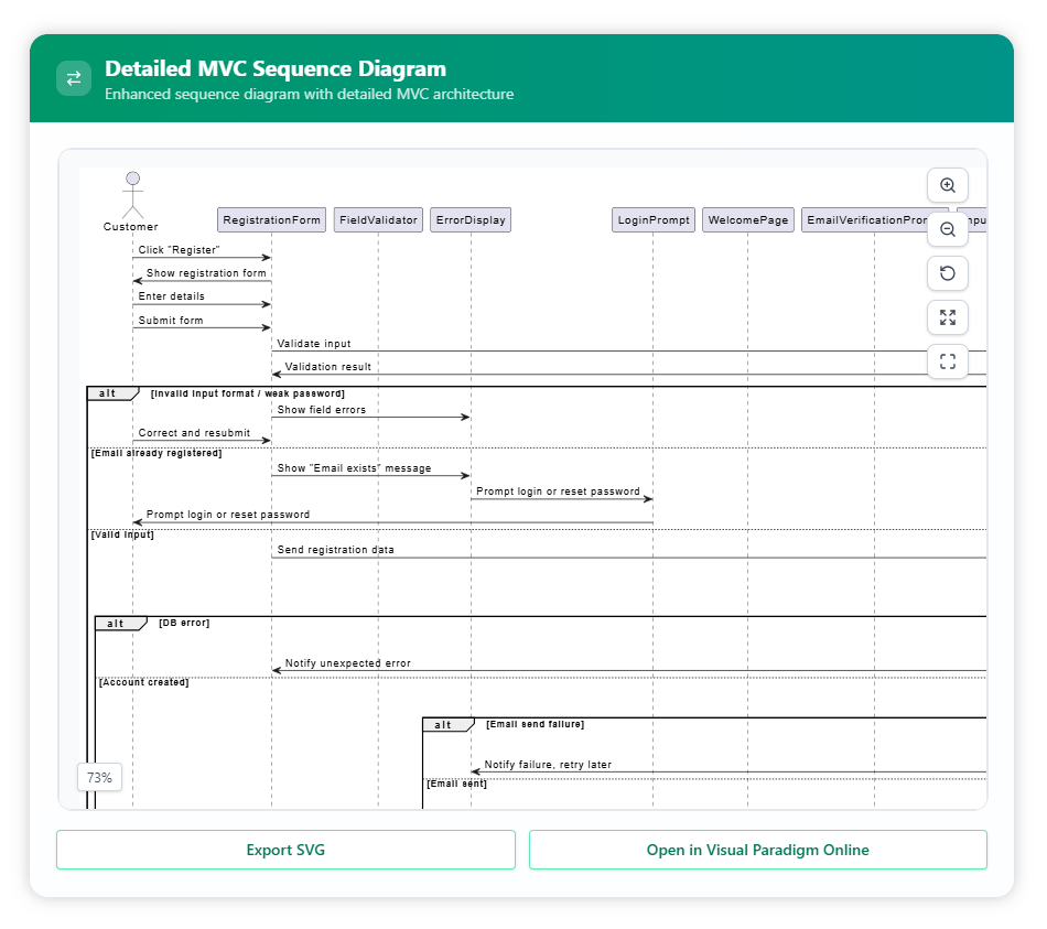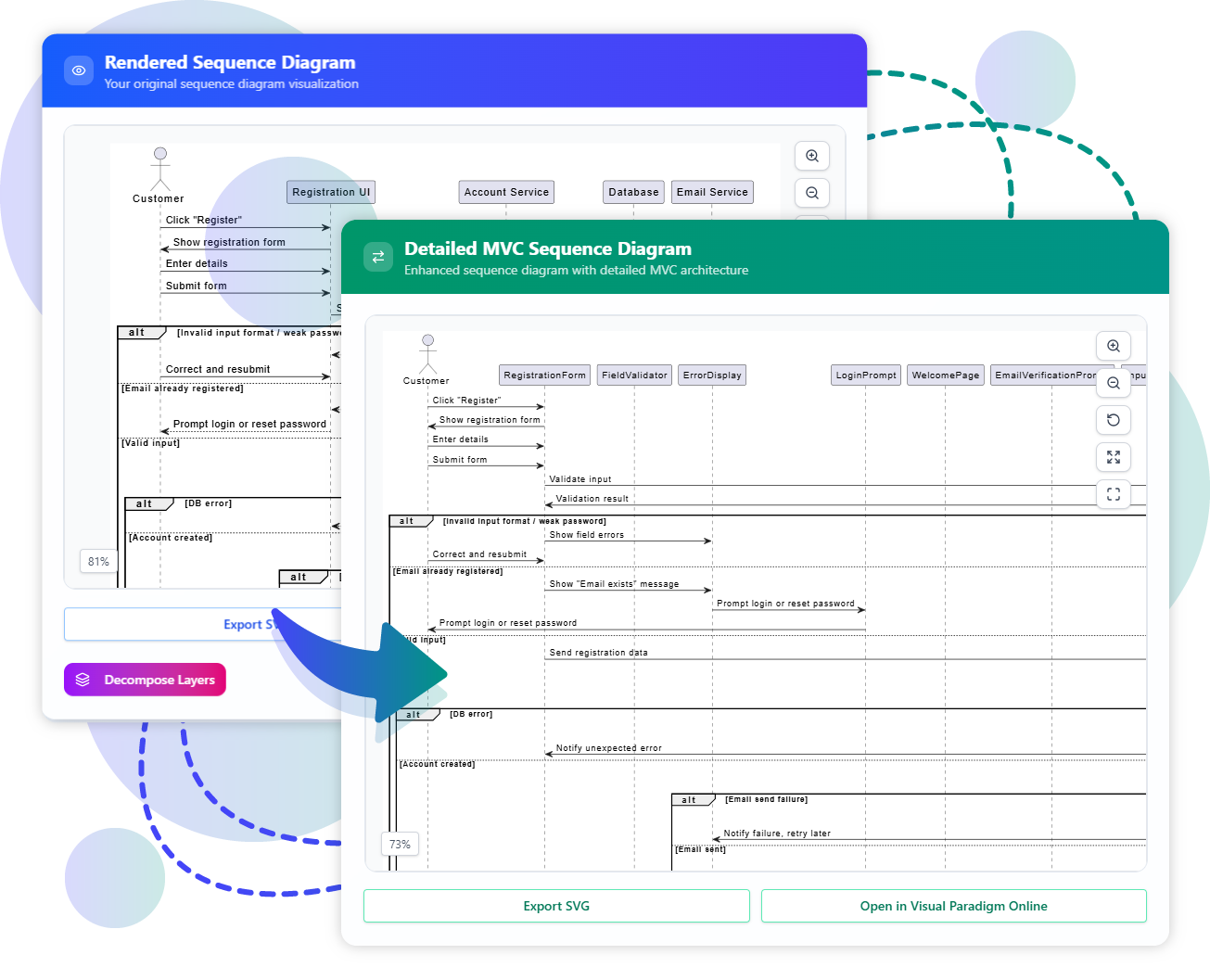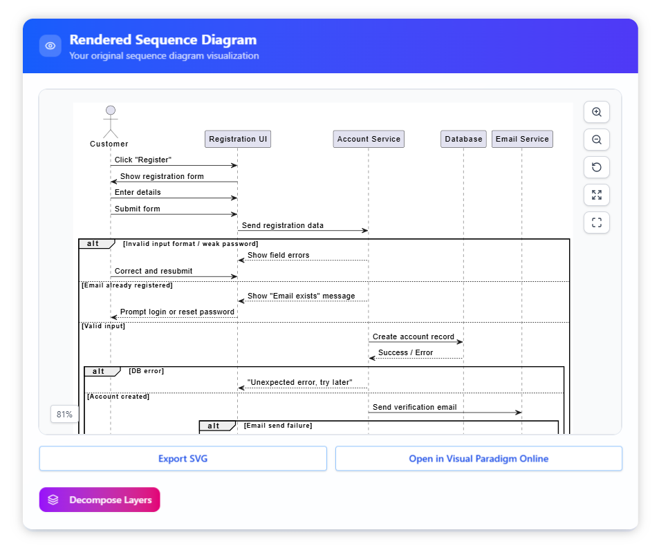 Click Render Diagram to display the initial registration flow. You can save this view as SVG or adjust the design directly in Visual Paradigm Online. To transition into the AI refinement stage, select Decompose Layers.