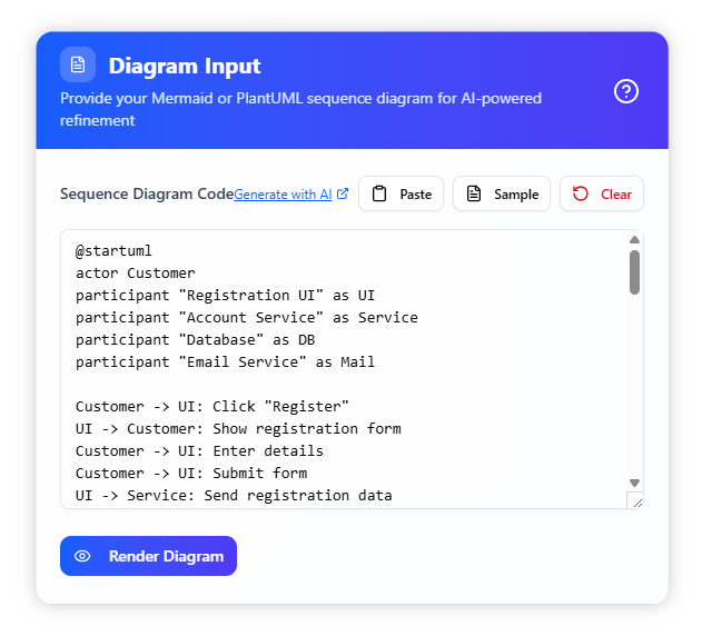 Provide your Mermaid or PlantUML sequence diagram that represents the account registration workflow. If you do not have one ready, the MVC System Architecture Generator can instantly create a starting diagram for you.