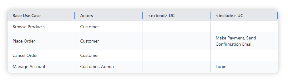 After analyzing, the system generates a summary table showing each base use case, its related actors, and the include or extend relationships. This helps you quickly understand how the use cases connect without manually tracing lines in the diagram.