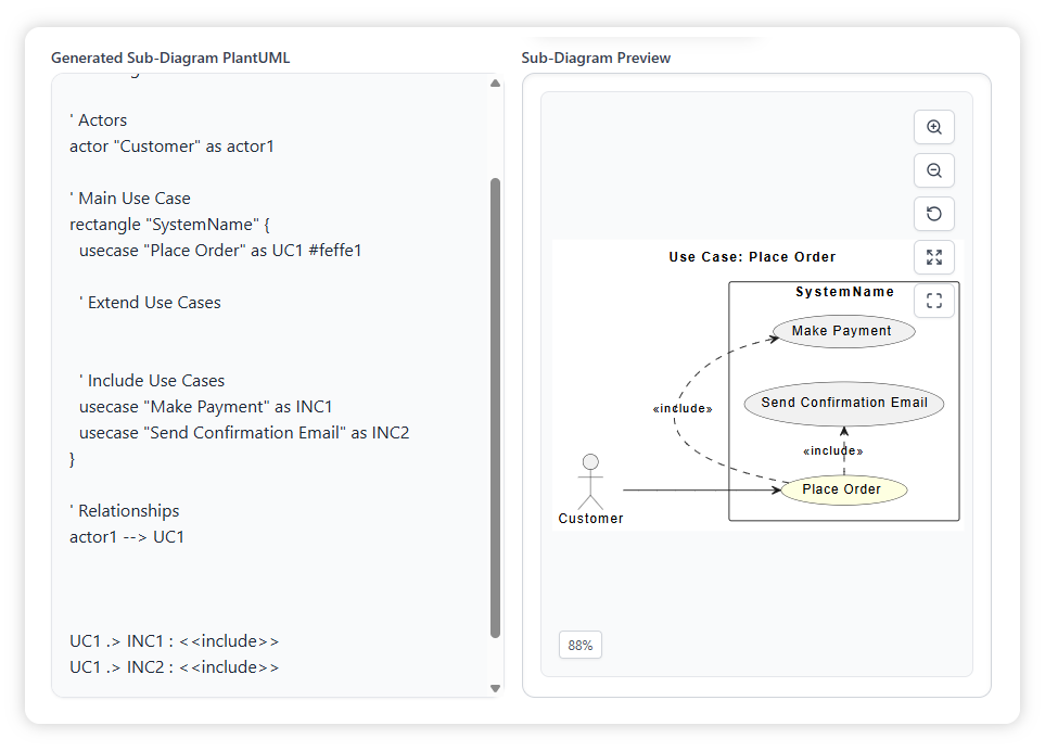 Click Generate Sub-Diagram to produce a simplified PlantUML diagram that highlights only the Place Order use case and its relationships. The diagram will be updated in the preview area, showing a clear view of the main flow.