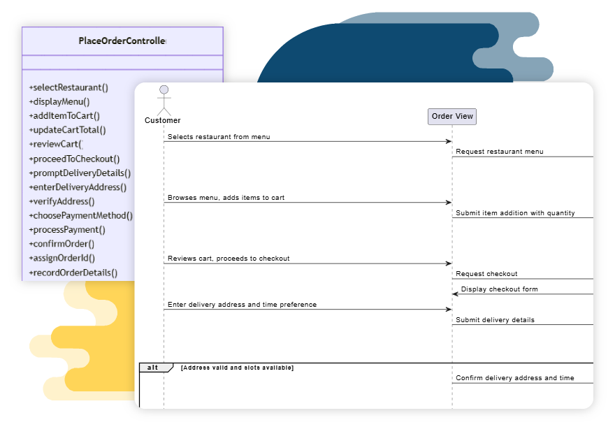 The Place Order use case is a key feature in food delivery and online ordering platforms. It demonstrates how a customer selects a restaurant, browses the menu, adds items to the cart, and reviews the total before finalizing the order. With the Sequence Diagram Refinement Tool, this familiar process can be broken down into MVC architecture, making it easier to see how user interactions connect to backend order processing.