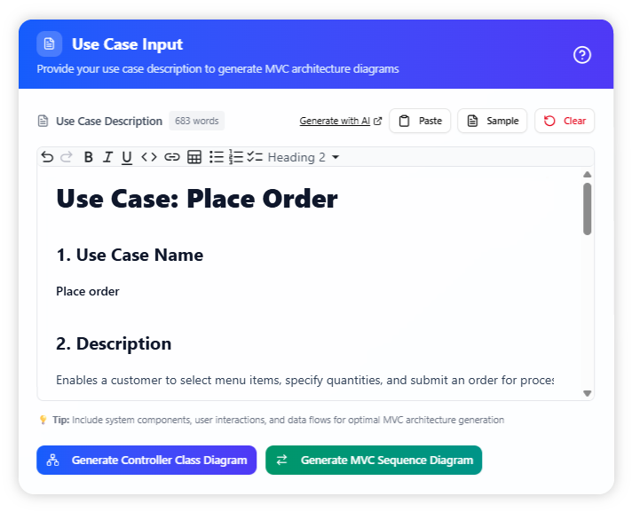 Afterward, you can instantly generate both the Controller Class Diagram and the MVC Sequence Diagram to continue the workflow.