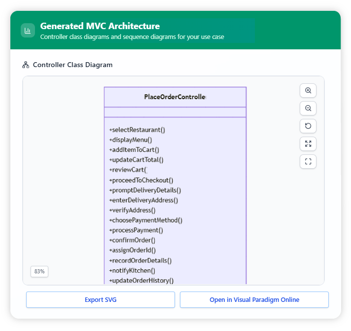 Based on the use case, the tool generates a controller class diagram that illustrates the order management logic. This provides a structured view of how the controller responds to customer actions before linking to models such as restaurants and menu items.