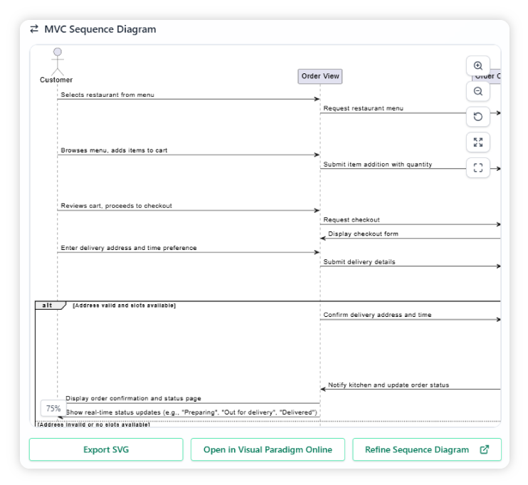 From the description, the tool builds a sequence diagram in MVC form. It traces how the customer (Actor) interacts with the restaurant selection and menu views, how the controller updates the cart, and how order data is prepared in the model.