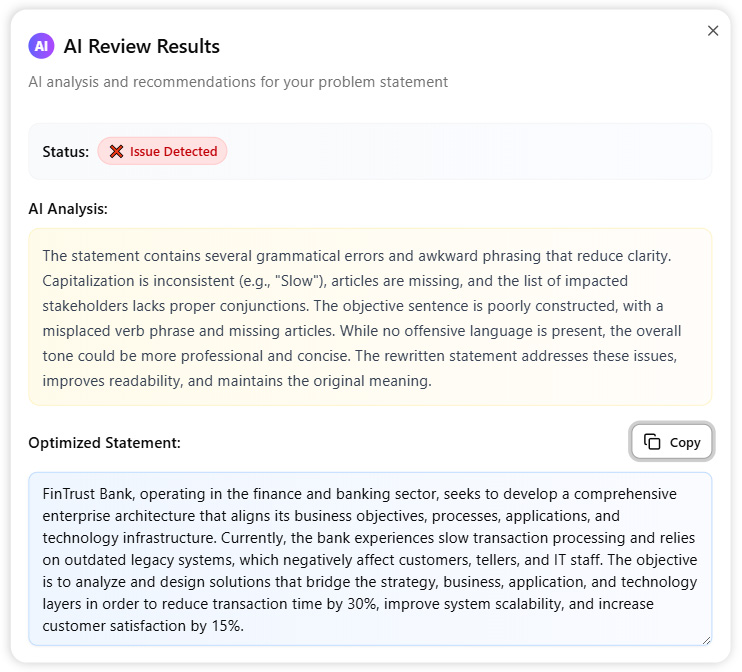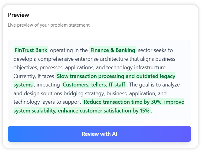 The user clicks the “Review with AI” button to enhance the description. The AI refines the requirements, ensuring compliance with banking regulations and suggesting scalable architecture solutions.