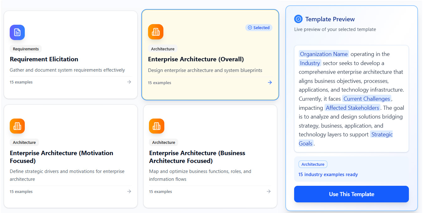 The user selects the Enterprise Architecture (Overall) template to align IT systems with business objectives.