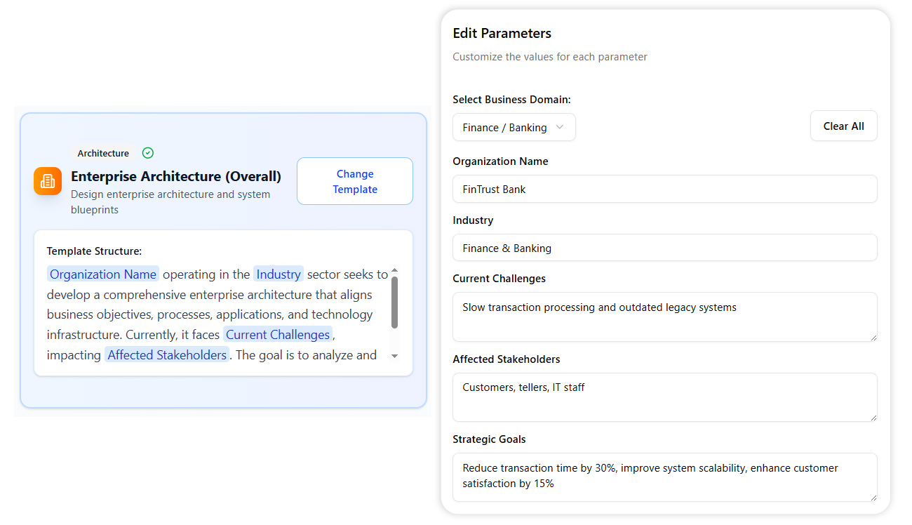 The user enters that FinTrust Bank, a finance and banking organization, faces challenges with slow transaction processing and outdated legacy systems, affecting customers, tellers, and IT staff, with strategic goals to reduce transaction time by 30%, improve system scalability, and enhance customer satisfaction by 15%.