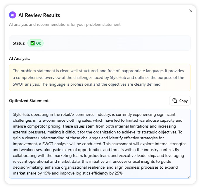 The user clicks the “Review with AI” button to enhance the description. The AI analyzes the inputs, incorporates e-commerce trends, and suggests actionable strategies.
