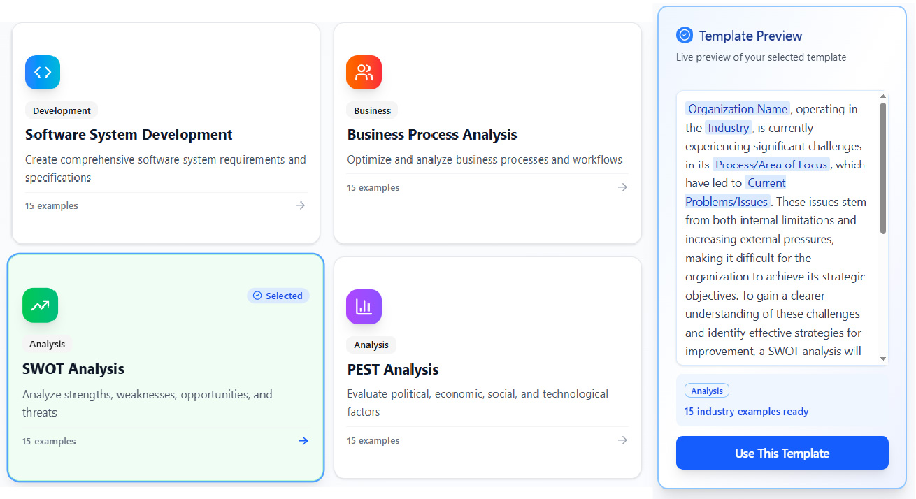 The user selects the SWOT Analysis template to analyze strengths, weaknesses, opportunities, and threats.