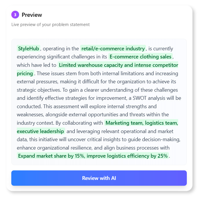 In this article, we will show you how to use AI to generate a problem description like this step by step, tailored for fashion retail expansion.