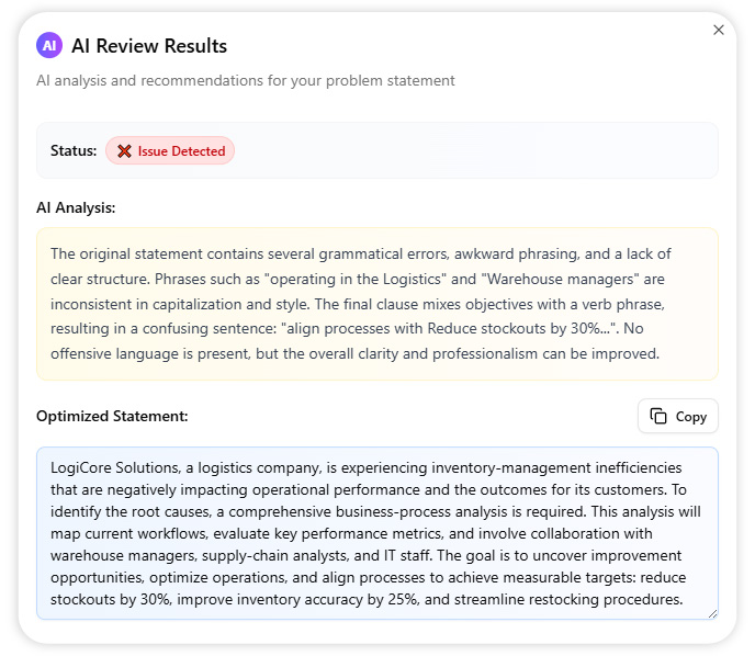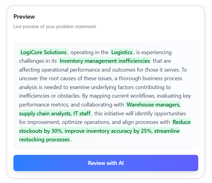 In this article, we will show you how to use AI to generate a problem description like this step by step, tailored for inventory management processes.