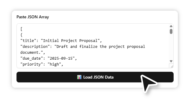 Copy and paste the JSON array into the app’s input field and click “Load JSON Data”. The application would instantly parse the data and render an interactive, editable table with columns for title, description, due date, priority, and completed.